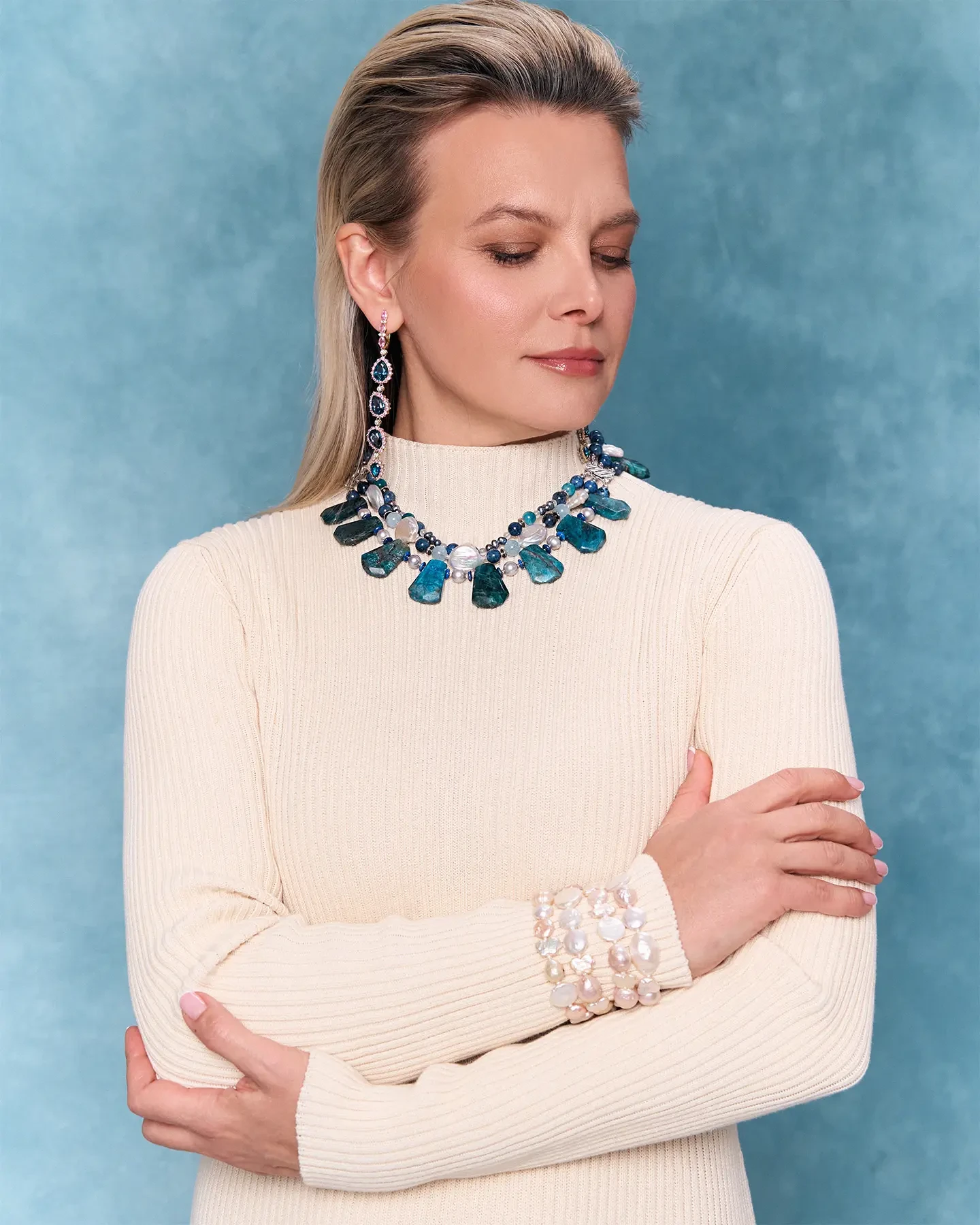 В ювелирной практике апатит долгое время считался «полудрагоценным» камнем. Но сегодня это деление теряет смысл: в руках умелого мастера апатит становится не акцентом второго плана, а главным героем изделия. Его прозрачность и богатый спектр оттенков работают в паре с металлами — от белого золота до розового, — создавая ансамбли, которые выглядят свежо и современно.