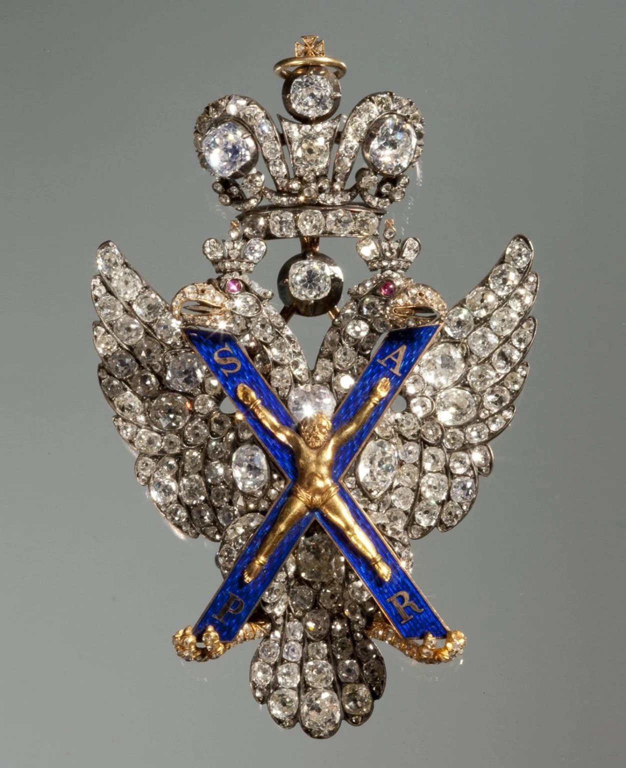 Пётр I учредил в 1698-м — главная награда империи, знак, звезда, голубая лента, девиз «За веру и верность». В кладовой circa 1800-го: бриллианты, рубины, эмаль, специальные варианты с алмазами для императорской семьи и фаворитов.