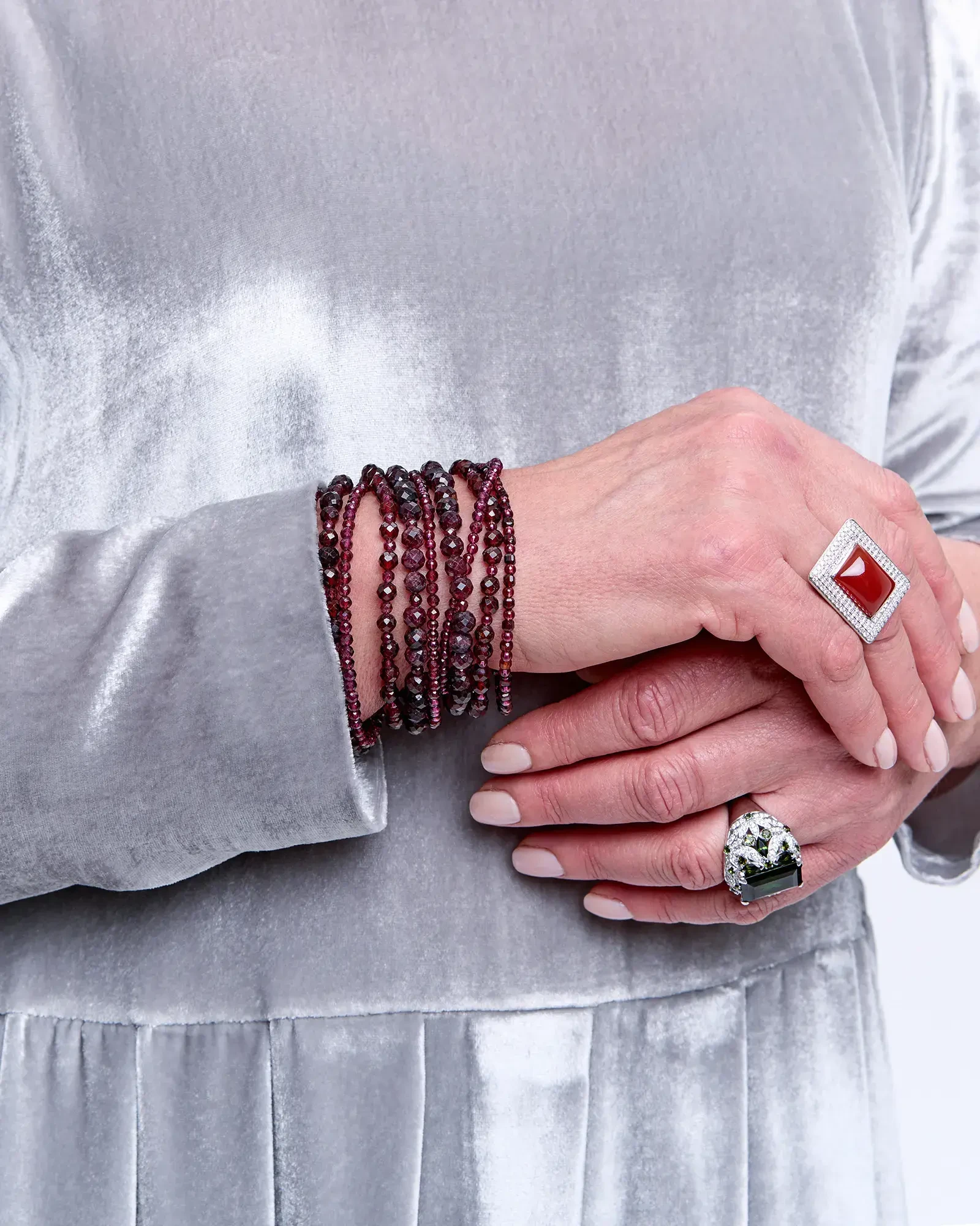 Украшения для Овна редко бывают миниатюрными. Чёткие линии, заметный объём, выразительные формы — именно так проявляется этот знак в ювелирном дизайне. Белое и жёлтое золото, платина, иногда сочетание металлов — всё, что выглядит уверенно и не требует объяснений. Овнам подходят украшения, которые держат форму и не теряются в образе: кольца с характерным кастом, серьги с чёткой геометрией, броши с динамичным рисунком. Многорядный пышный браслет со сверкающими в огранке гранатами - это смелая сияющая доминанта, идеально резонирующая с лидерской натурой и внутренней силой Овна.