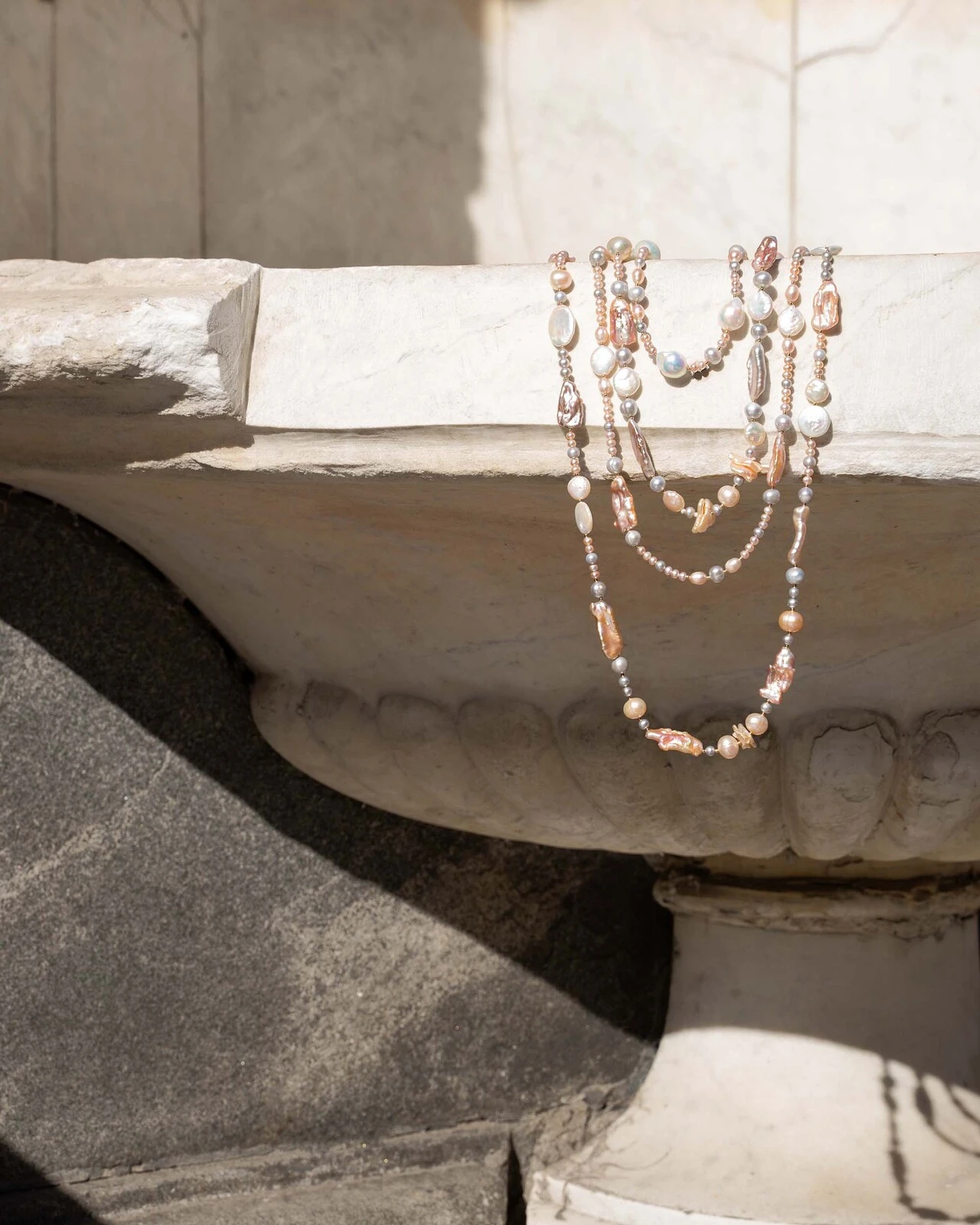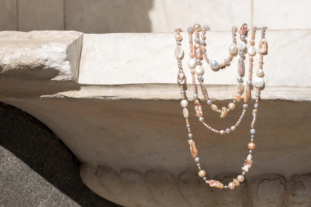 Колье и подвески: жемчужные ожерелья стали ключевым элементом для создания многослойности. Их носят с цепями разной длины, подвесками или даже с другими жемчужными нитями, создавая индивидуальный и яркий образ.