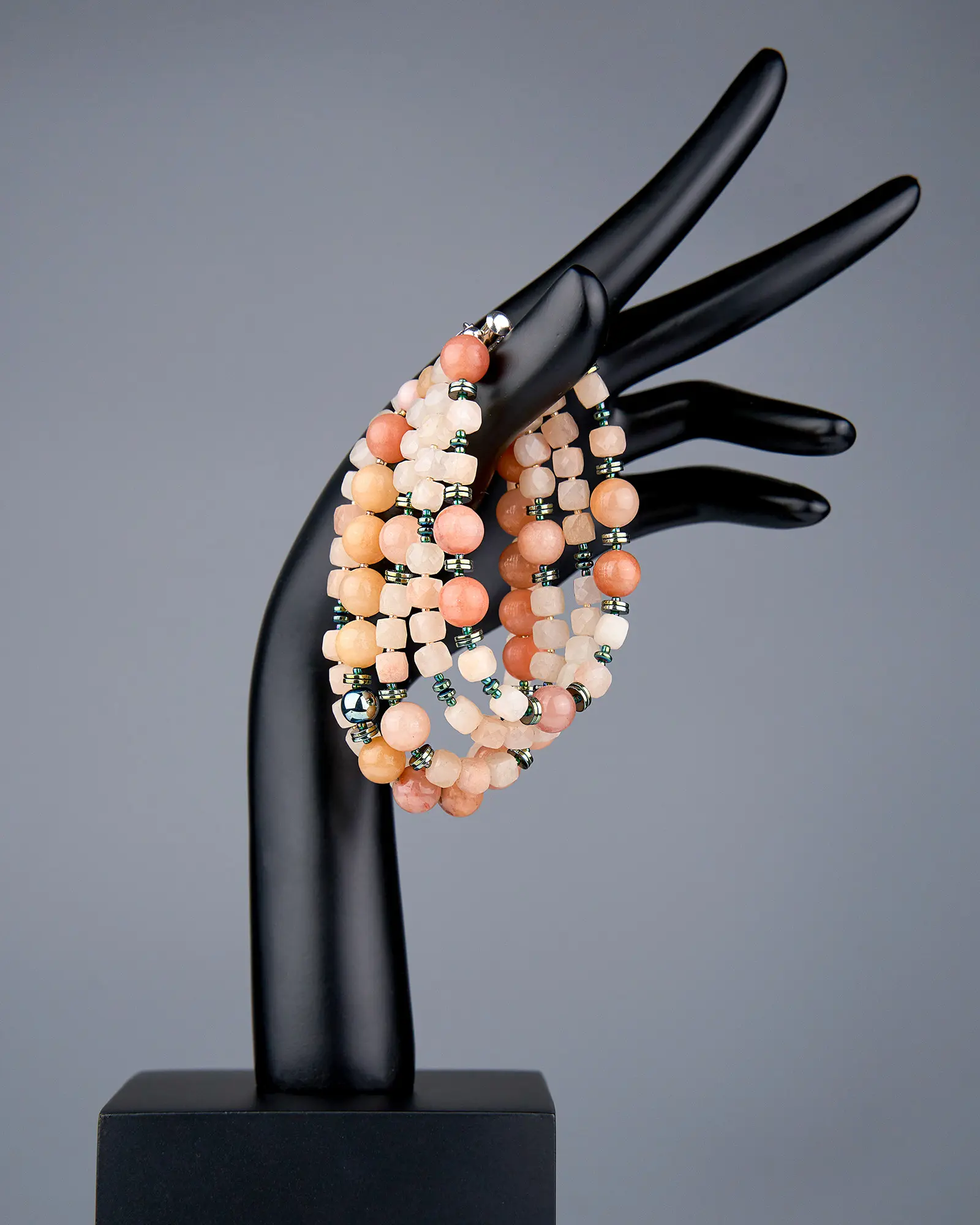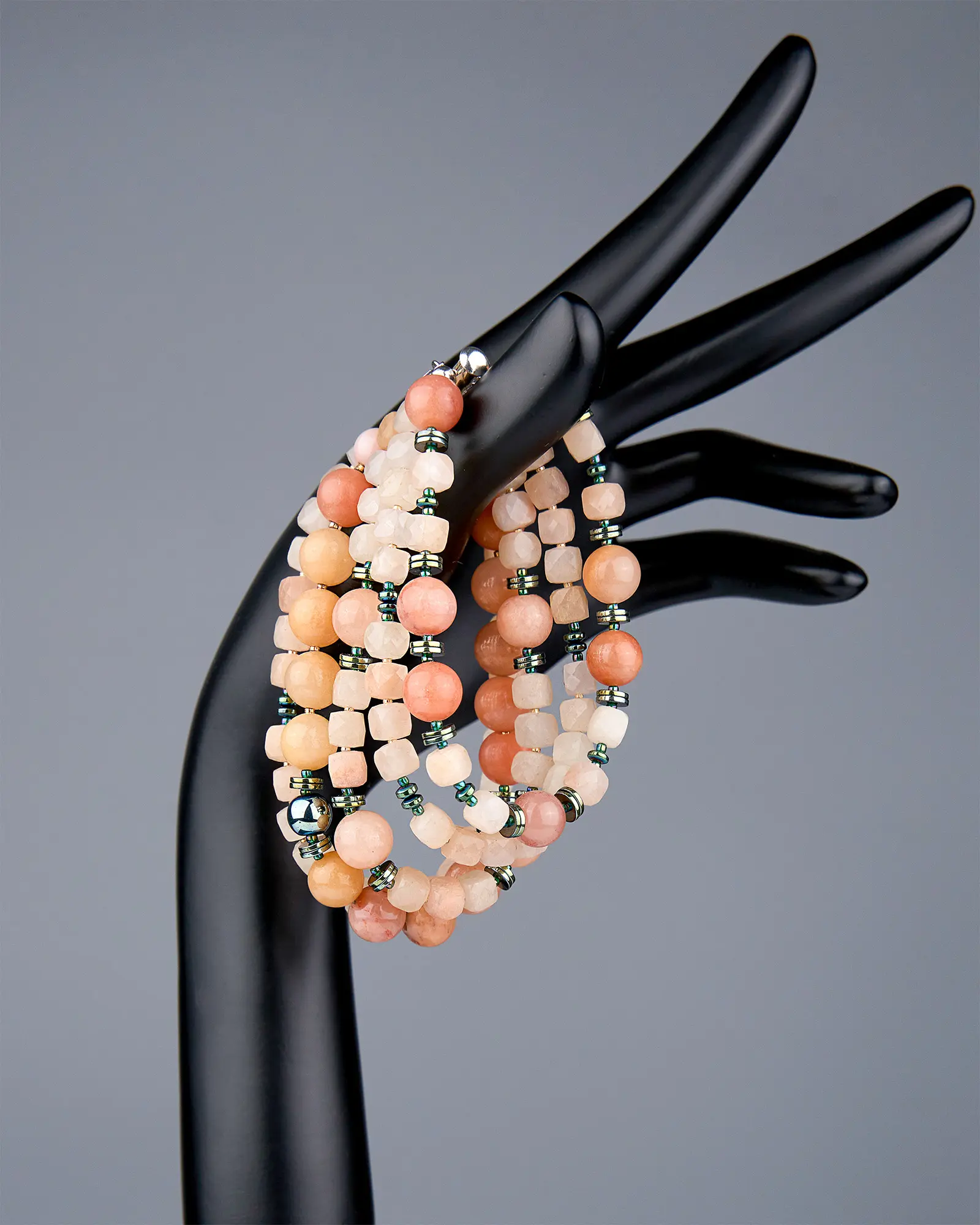Персиковые оттенки кварца восхищают своей мягкостью, а гармоничное сочетание различных форм бусин подчеркивает элегантность вашего образа. Браслет идеально подойдёт для романтичных встреч, деловых дней и стильных вечеринок с подругами, добавляя особого шарма каждому вашему движению!
