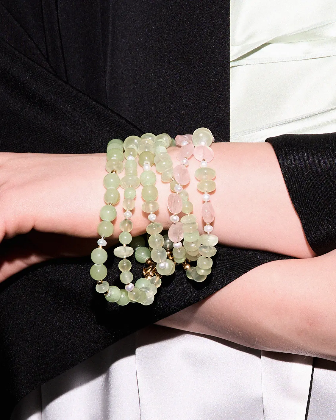 Пять изящных рядов, объединивших палитру утонченных оттенков: нежную зелень пренита, мягкий розовый кварц и сияние жемчуга. Этот браслет — пример абсолютной гармонии, где каждый камень дополняет другой, создавая приятный цветовой переход и объем. Идеально сбалансированный дизайн делает его универсальным аксессуаром: он так же уместен с кашемировым свитером, как и с коктейльным платьем. Для тех, кто ценит эстетику, выбирает вещи с характером и историей. Украшение, которое не просто носят — его коллекционируют.