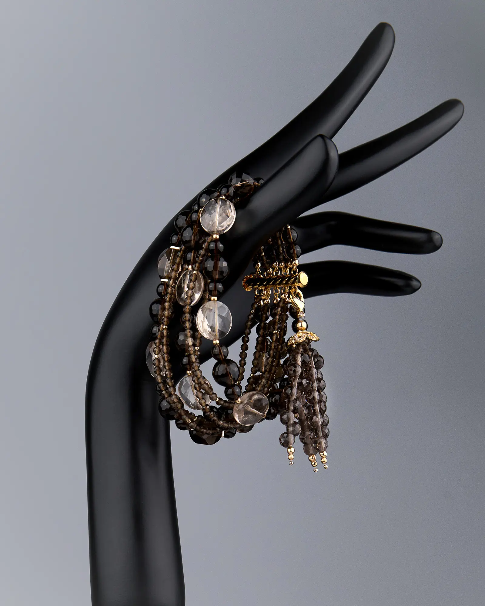 Этот браслет задуман как ваш личный инструмент для стиля. Несколько рядов благородного раухтопаза шоколадного оттенка создают сдержанную, но выразительную основу. А съемная кисточка дает полную свободу: оставьте ее скользящей по запястью для дерзкого акцента или снимите, чтобы повесить на цепочку в роли изящного кулона. Одна покупка, два кардинально разных украшения — вы просто переключаете режимы в зависимости от планов и настроения. Раухтопаз насыщенного коричневого оттенка идеально сочетаются с любым цветом в гардеробе, от базового черного до ярких тонов, и подходят буквально на любой случай. Практичная магия для тех, кто ценит не только красоту, но и возможность менять образы без лишних трат.