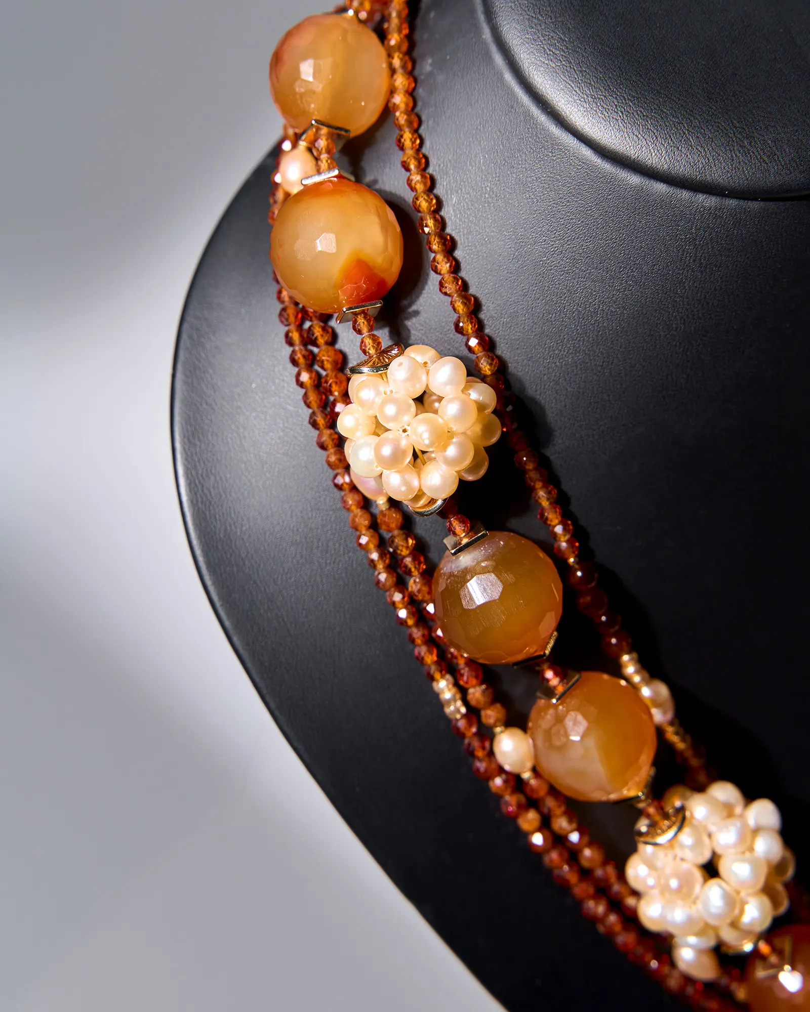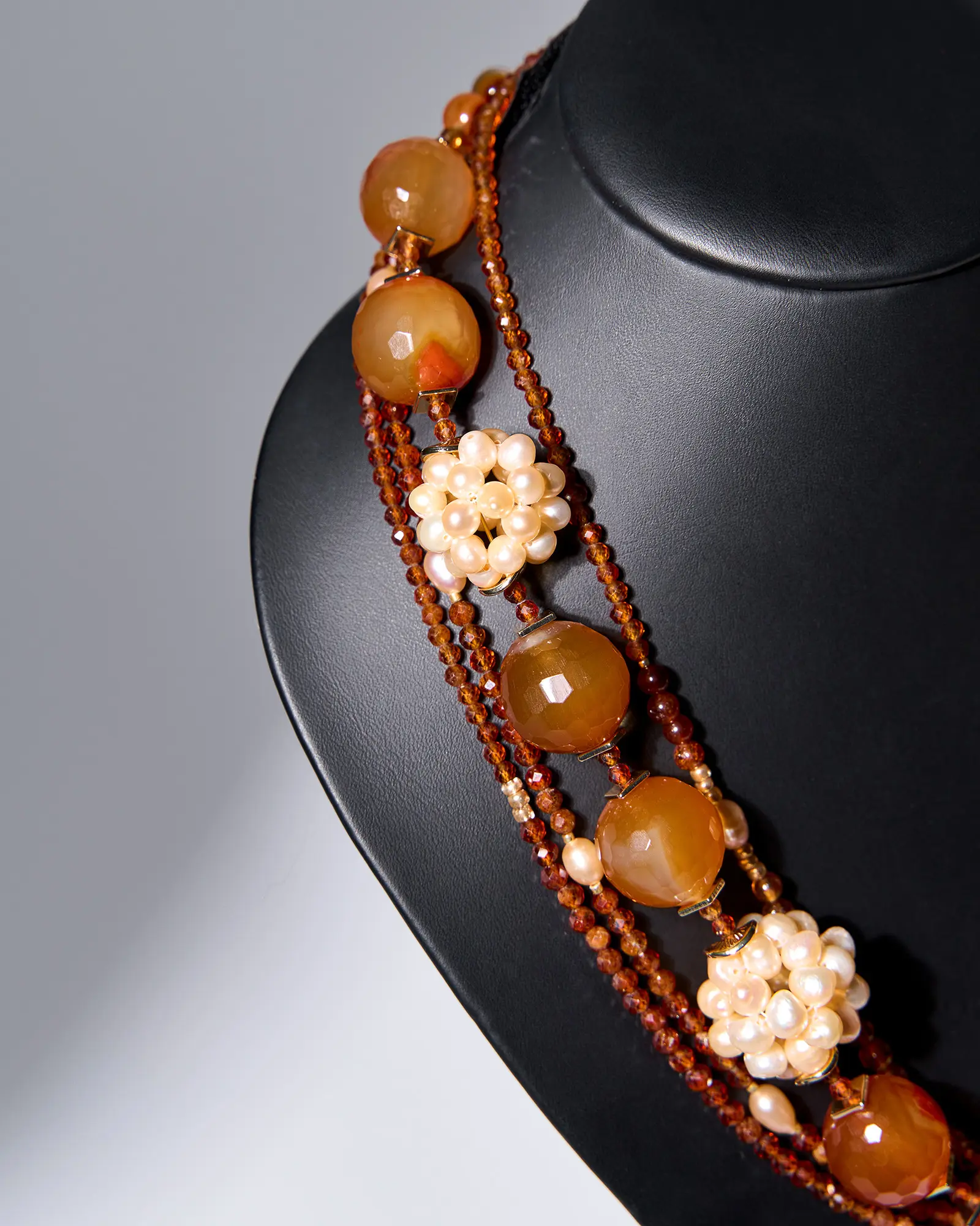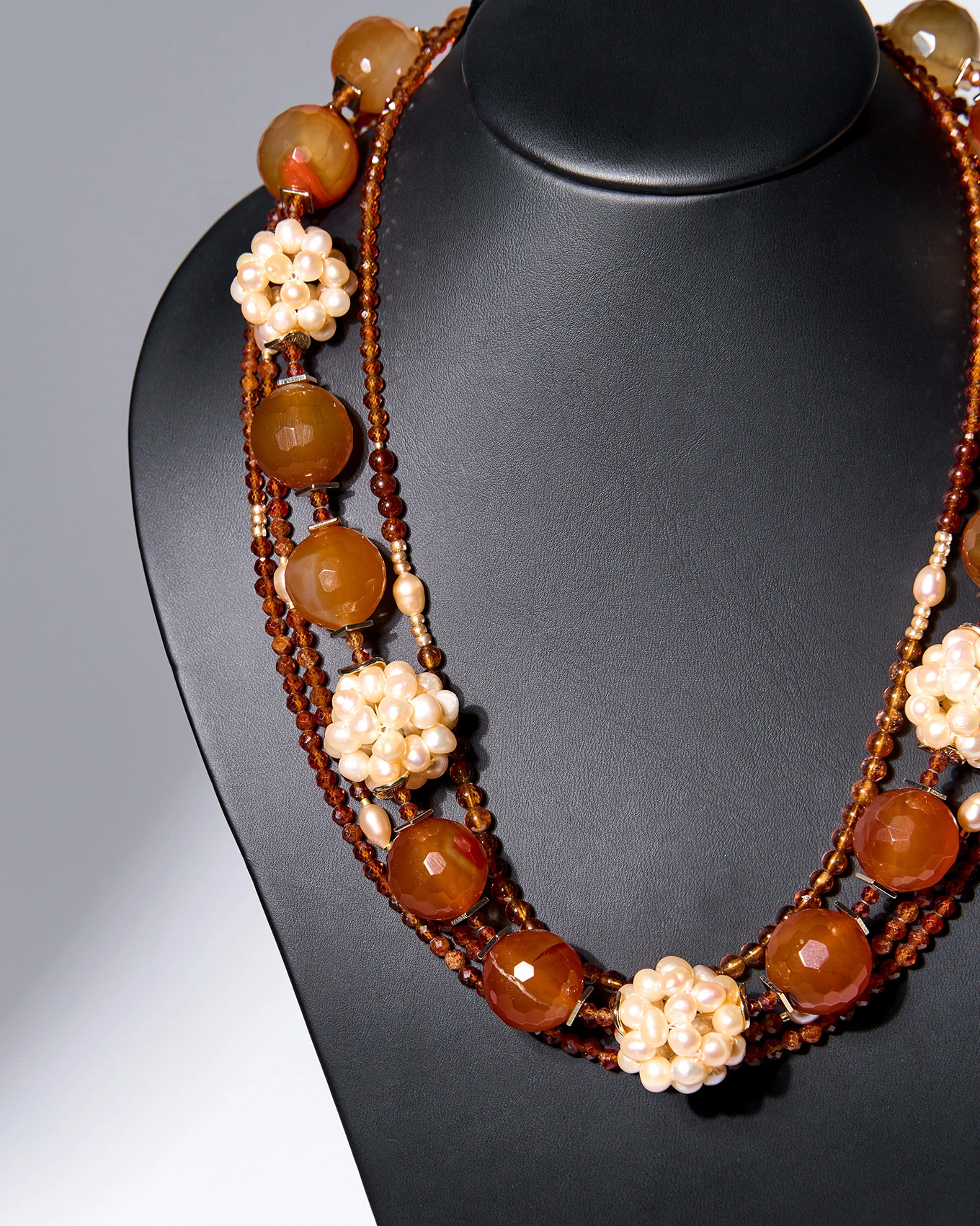 Бусы: гранат спессартин, сердолик, жемчуг.