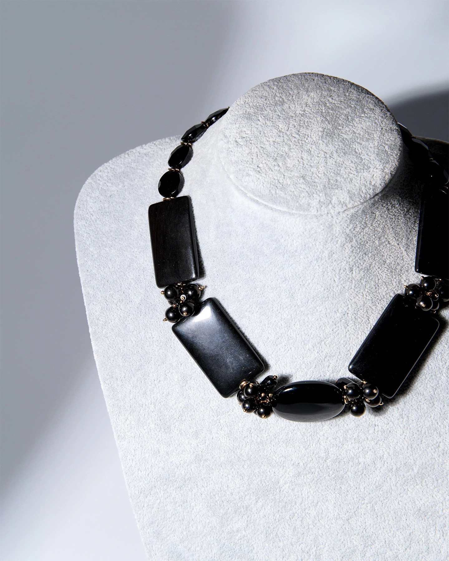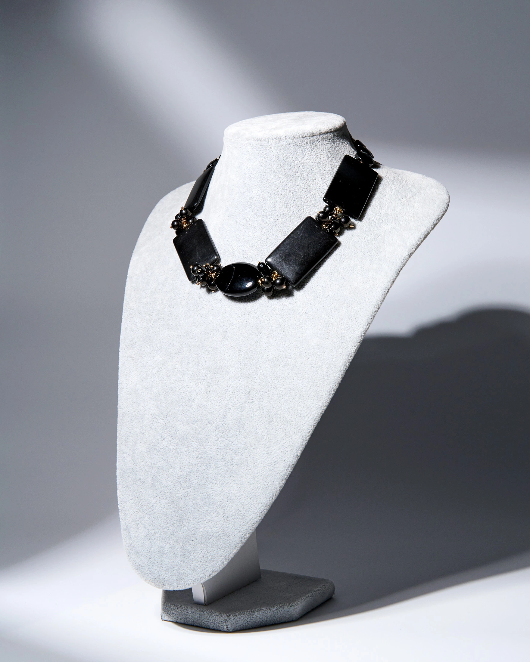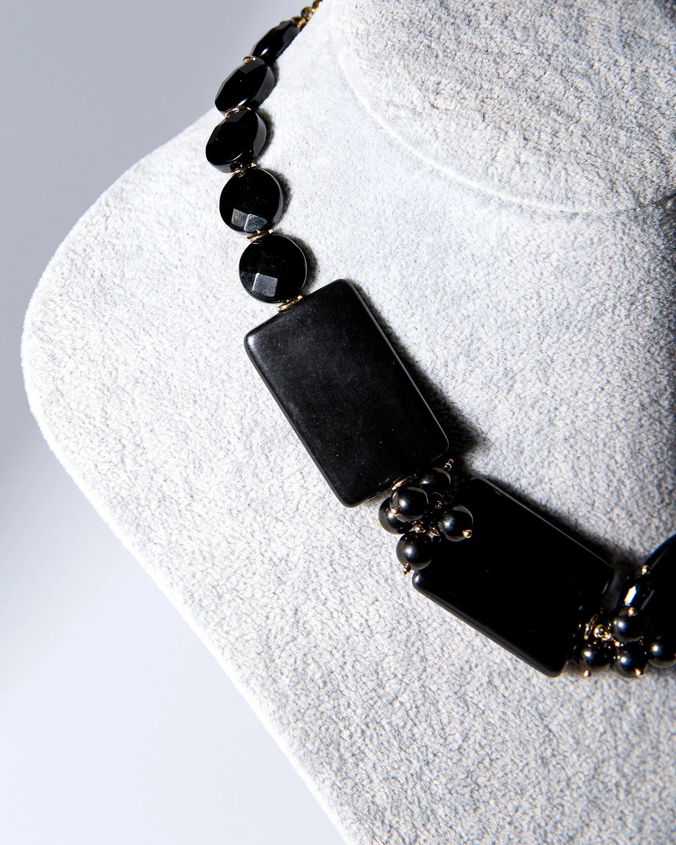 Глубокий чёрный блеск агата и матовая бархатистость гагата создают графичное украшение с характером. Контраст фактур делает бусы визуально объёмными, но при этом они выглядят аккуратно и лаконично. Это акцент для тех, кто предпочитает минимализм с лёгким драматическим настроением: идеально к total black, белой рубашке или вечернему платью.