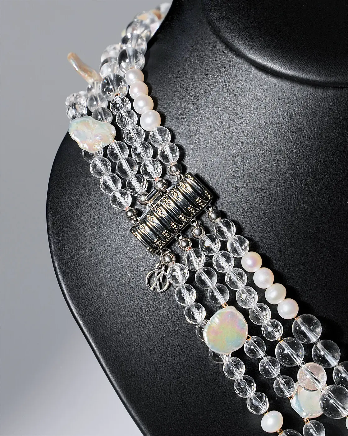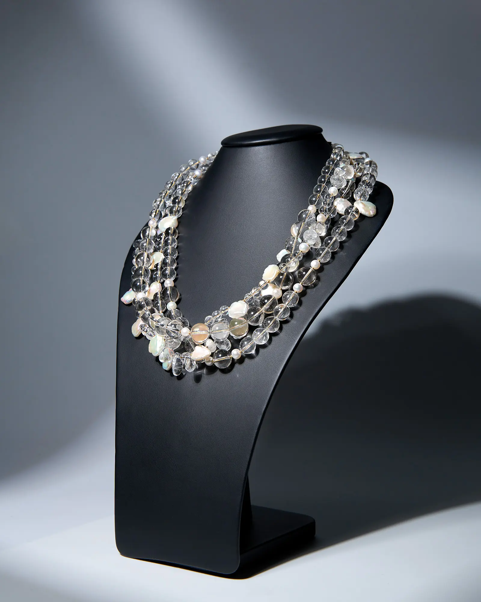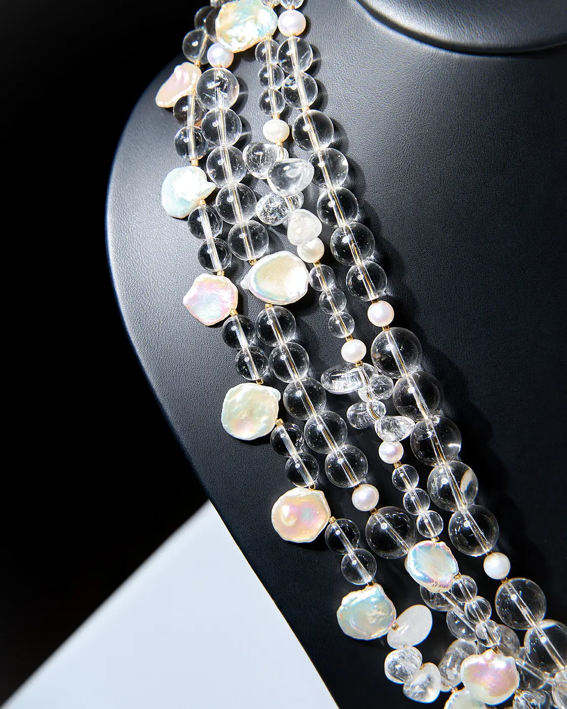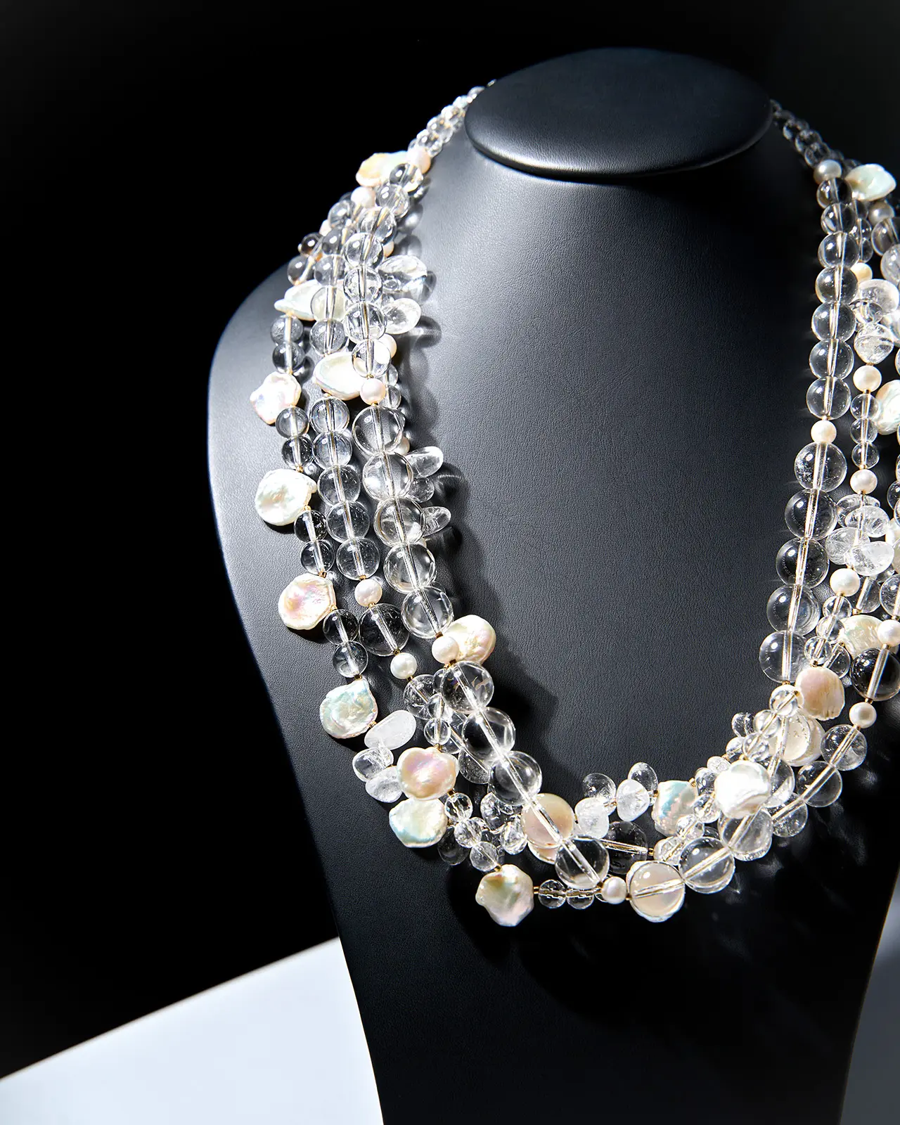 Это изделие — идеальное сочетание блеска и нежности. Горный хрусталь, с его кристальной прозрачностью, олицетворяет чистоту и гармонию. Жемчуг Кеши, обладая уникальной текстурой и мягким блеском, добавляет нотку роскоши и естественности.