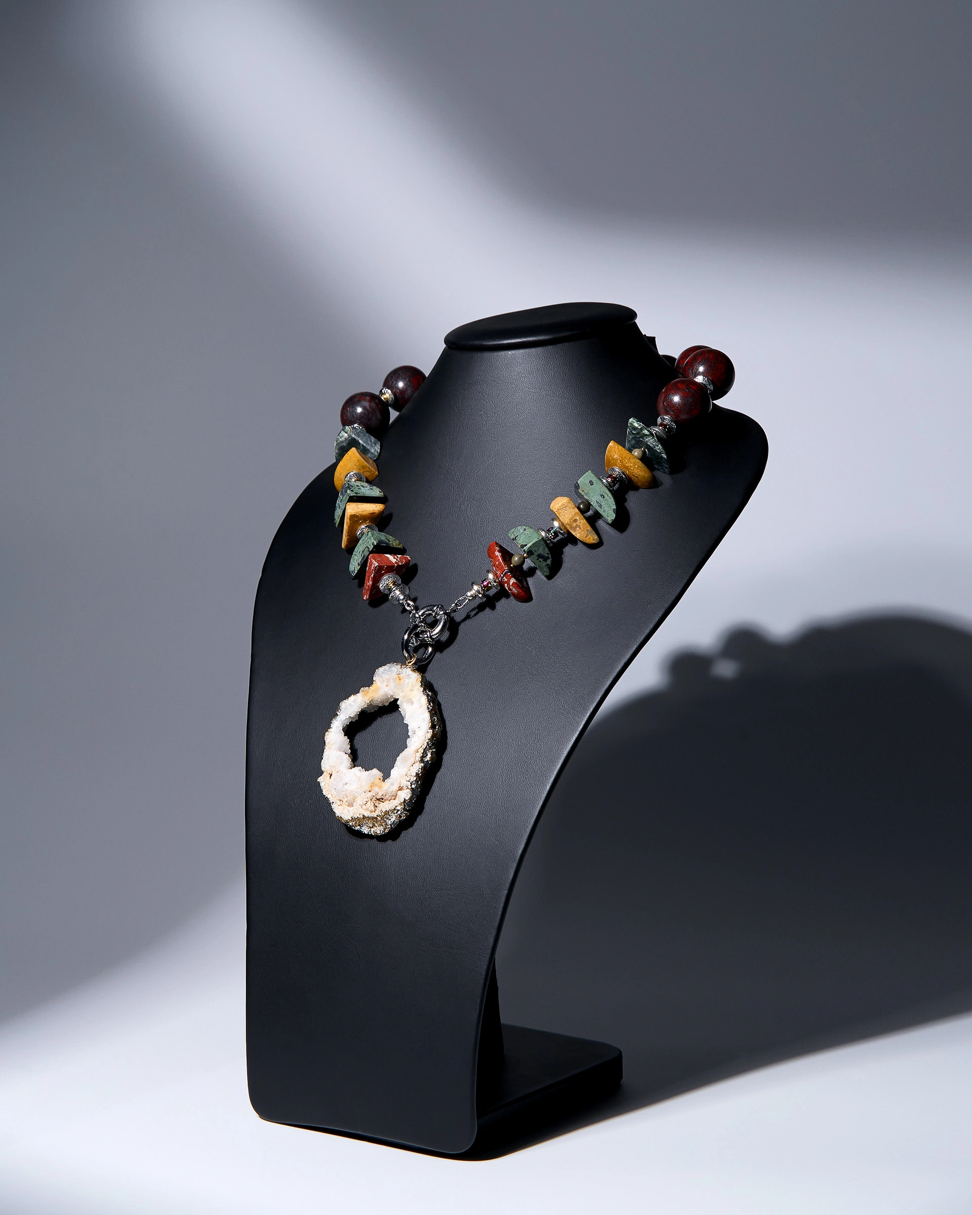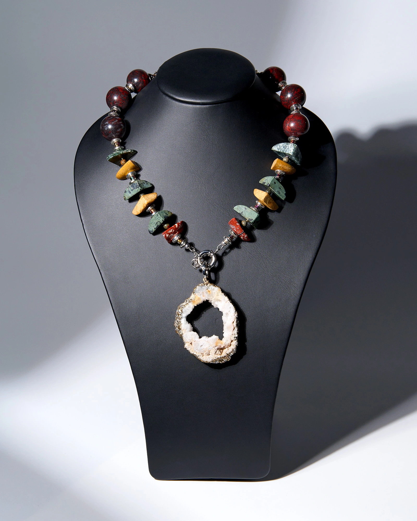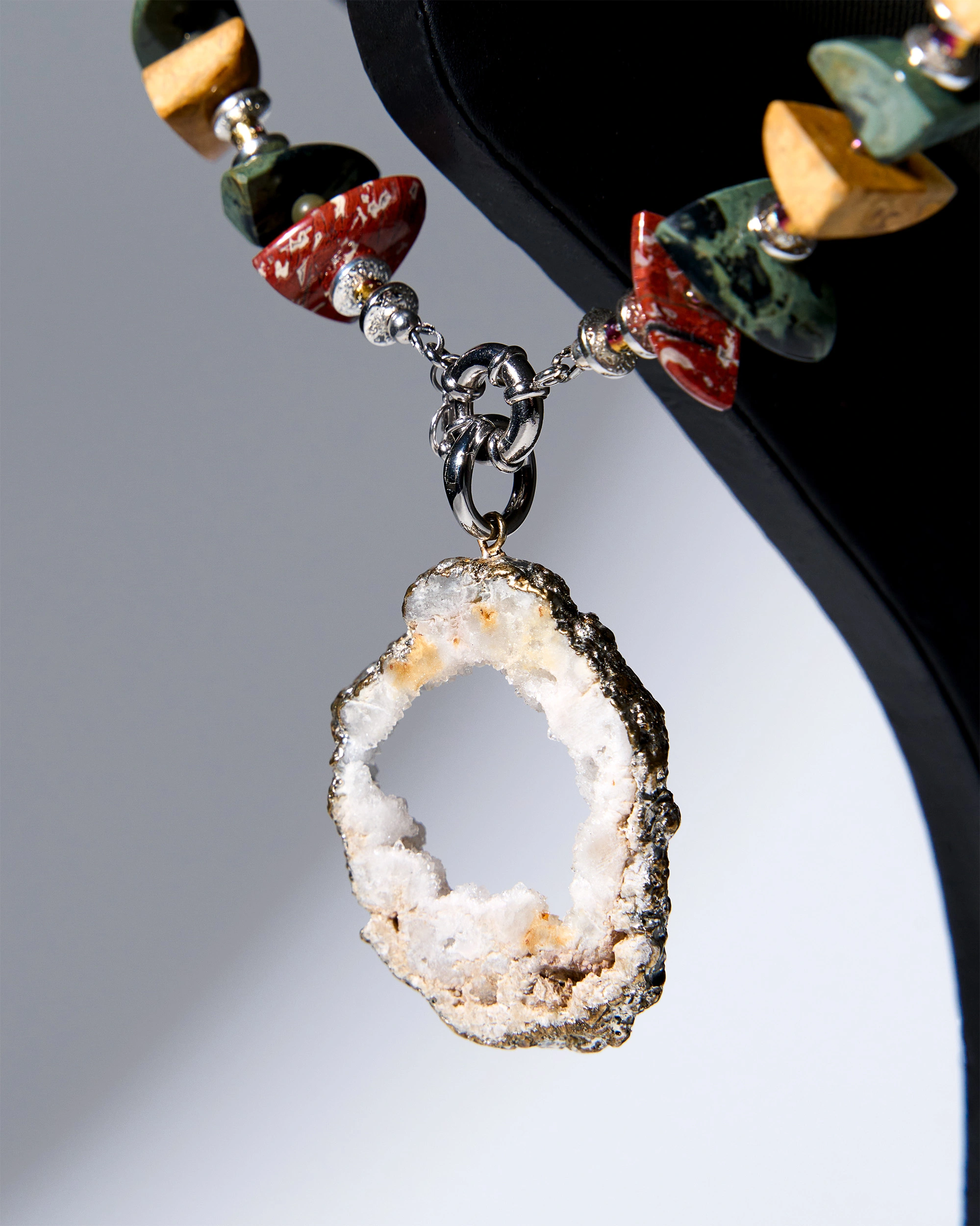 Крупные бусы из разных видов яшмы и серафинита со съёмным кулоном из друзы агата. Объёмные камни в природной гамме и фактурный кулон формируют заметный акцент и хорошо смотрятся с платьями, свитерами, рубашками и костюмами. Кулон легко снять, поэтому у вас сразу два варианта: более спокойный на каждый день и более выразительный — для встреч и мероприятий.