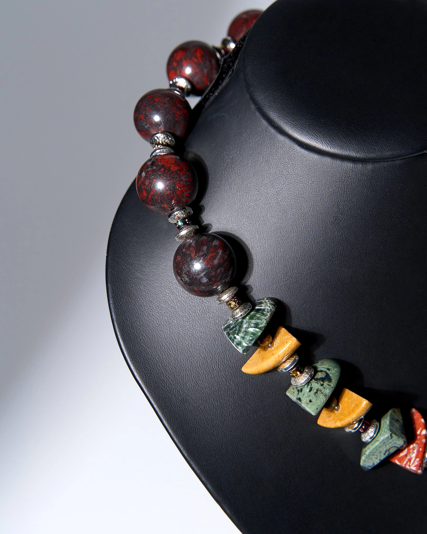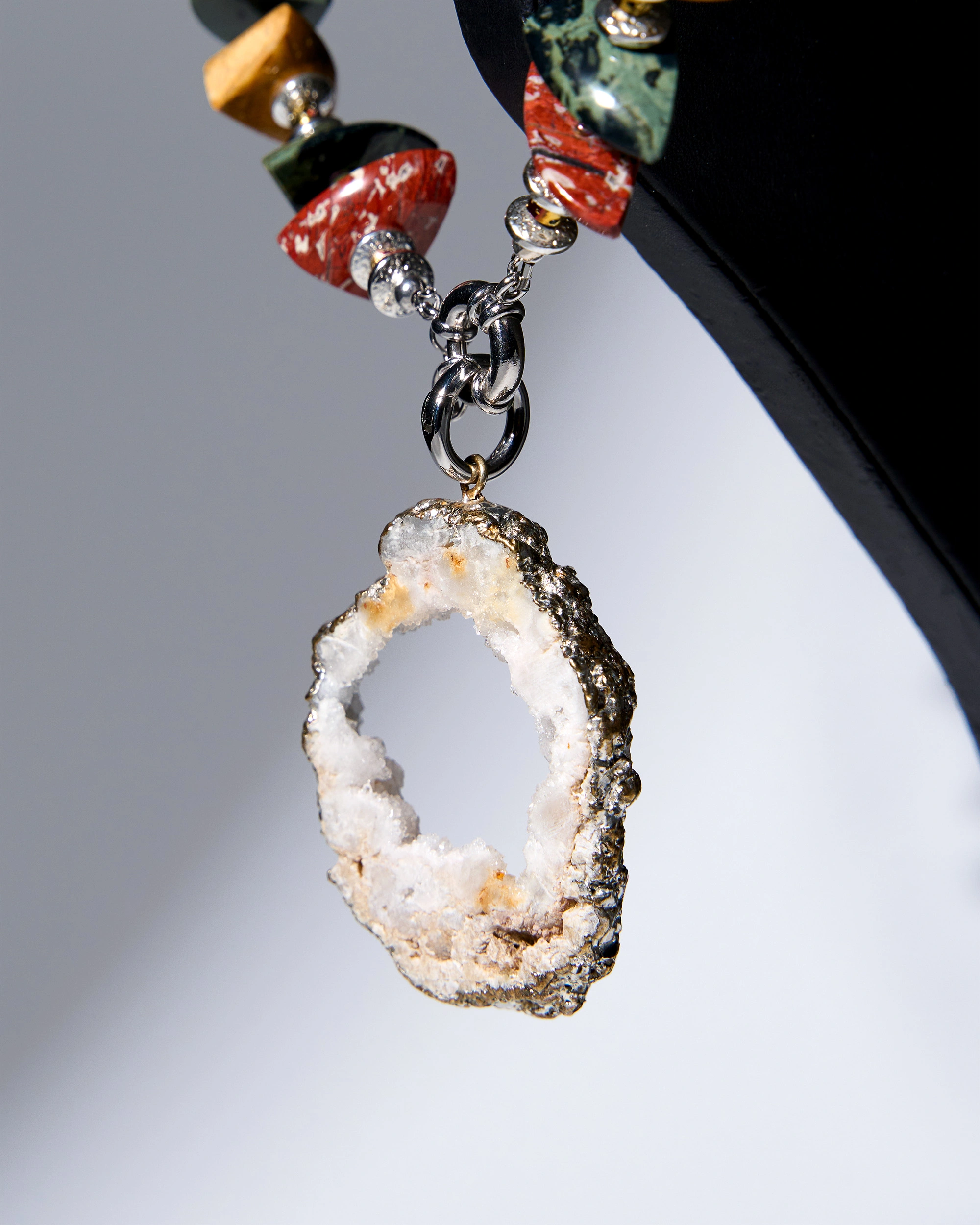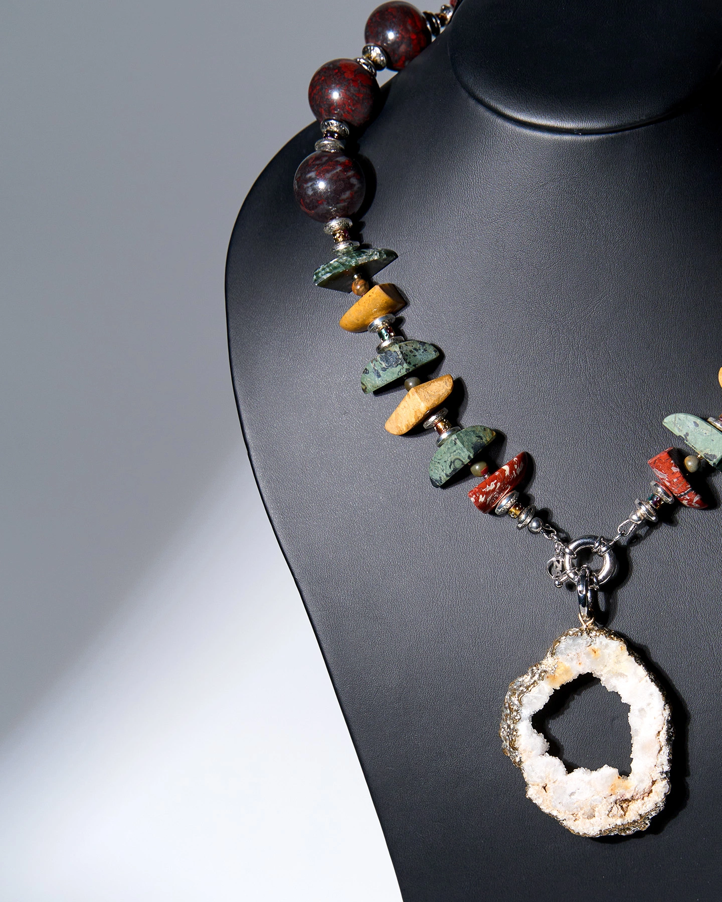 Крупные бусы из разных видов яшмы и серафинита со съёмным кулоном из друзы агата. Объёмные камни в природной гамме и фактурный кулон формируют заметный акцент и хорошо смотрятся с платьями, свитерами, рубашками и костюмами. Кулон легко снять, поэтому у вас сразу два варианта: более спокойный на каждый день и более выразительный — для встреч и мероприятий.