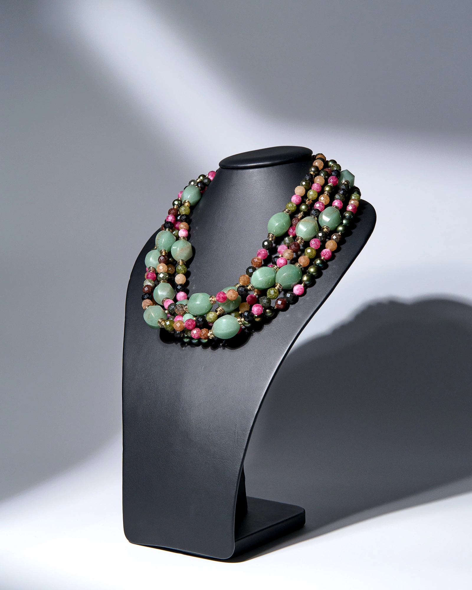 Многорядные бусы из кварца, жемчуга и авантюрина сразу дают готовый, «собранный» образ. Это то украшение, которое работает за вас: надеваете простую рубашку или однотонное платье — и выглядите так, будто продумывали комплект заранее. Один аксессуар хорошо работает с базовыми однотонными образами и сразу делает их визуально дороже и интереснее.