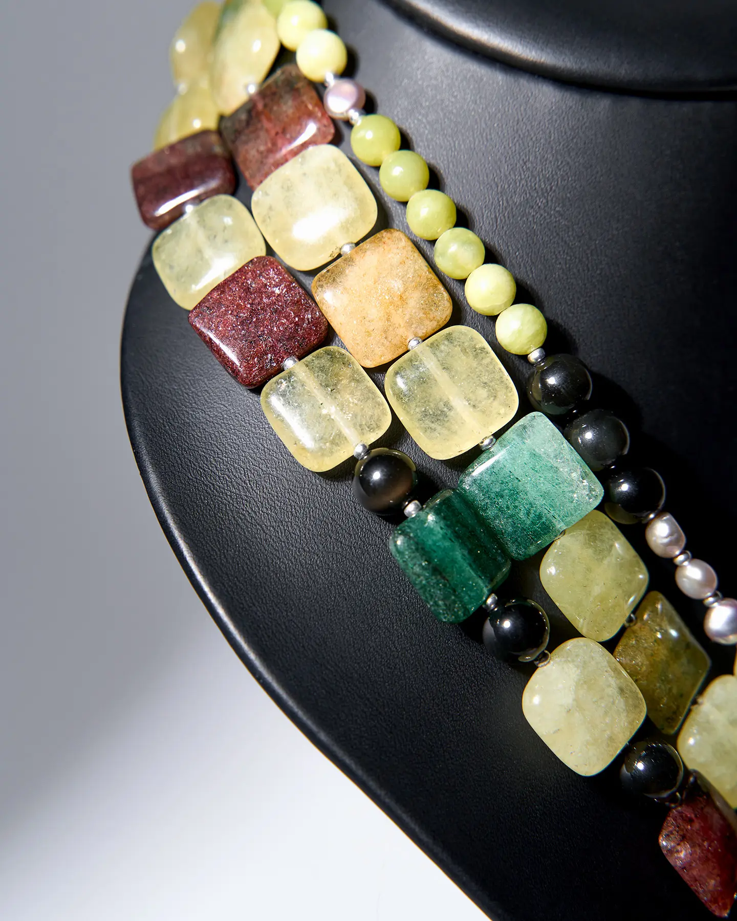 Бусы: пренит, обсидиан, хризолит, авантюрин, жемчуг, жадеит.