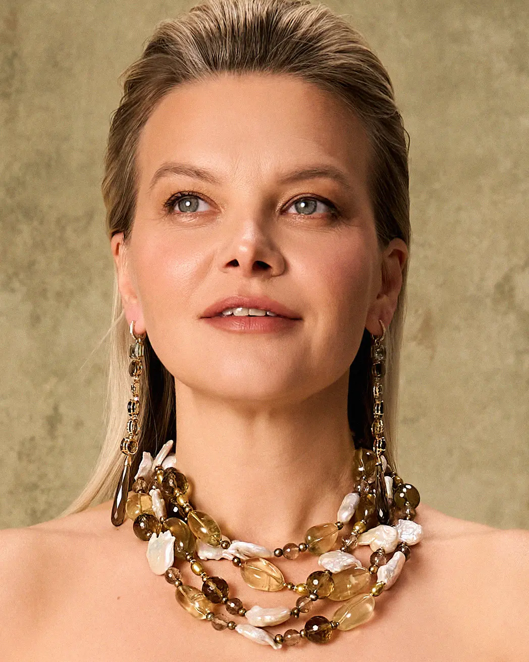 Изумительное колье для торжественных случаев. Гармоничная дизайнерская комбинация из крупных полупрозрачных бусин раухтопаза и цитрина великолепного качества, дополненная мягким сиянием жемчуга. Каждый камень выбран с особой тщательностью, чтобы создать симметричный и сбалансированный рисунок бус. Эти бусы - идеальный выбор для тех, кто ищет украшение качества люкс, которое станет настоящим сокровищем Вашей коллекции. Идеальный аксессуар для вечернего образа, роскошный подарок женщине на особенную дату, украшение, которое может стать фамильной драгоценностью!