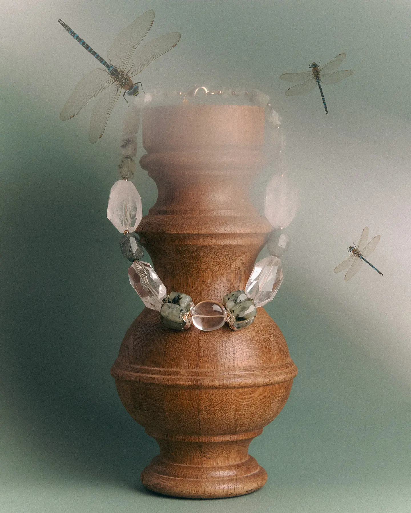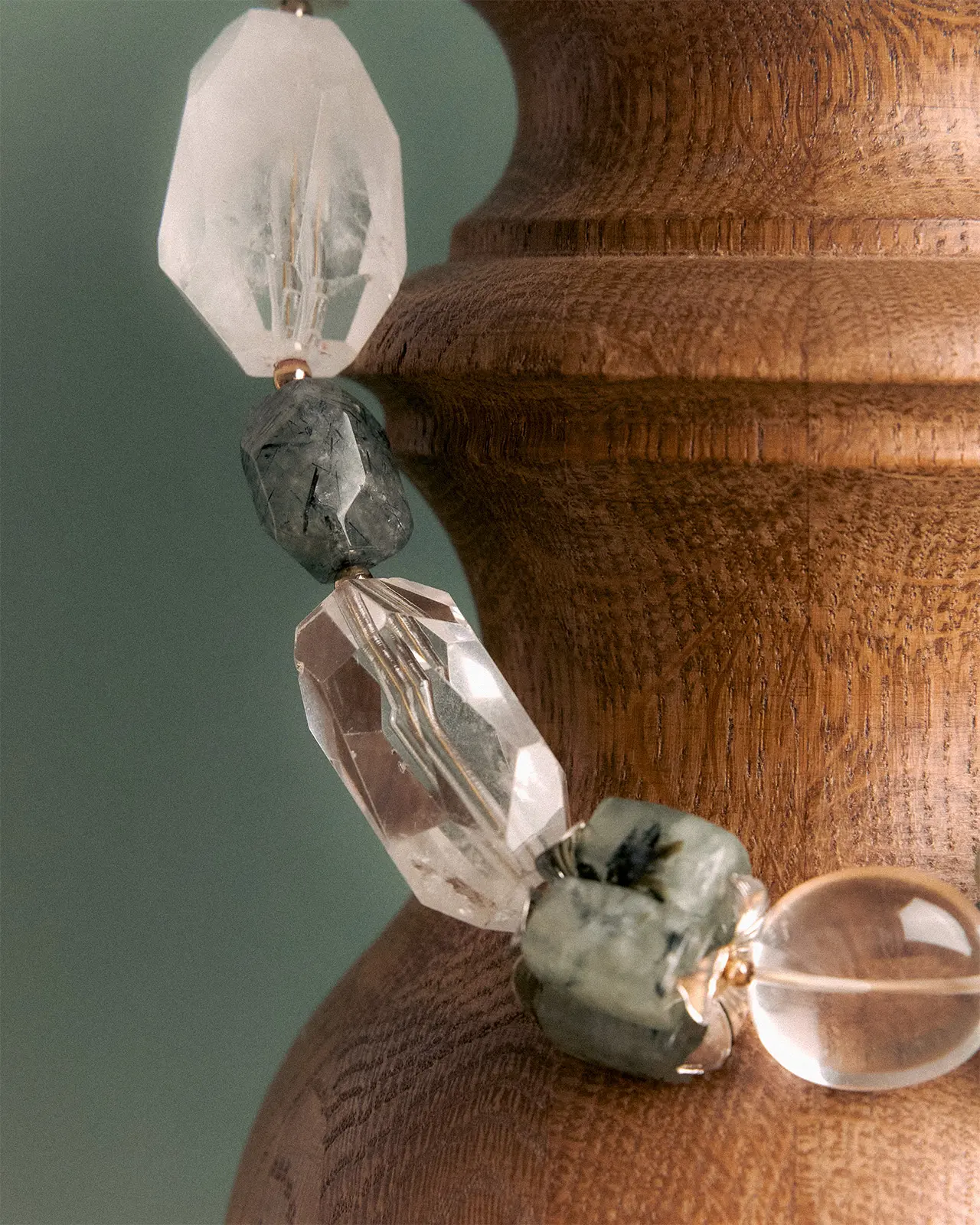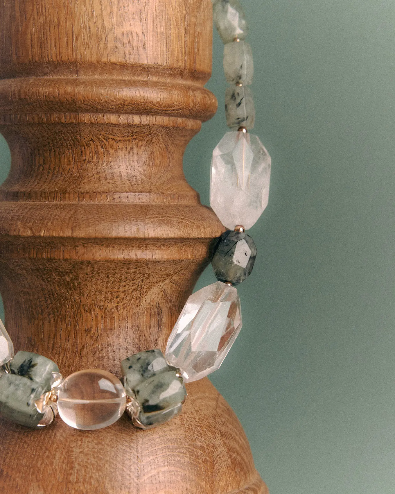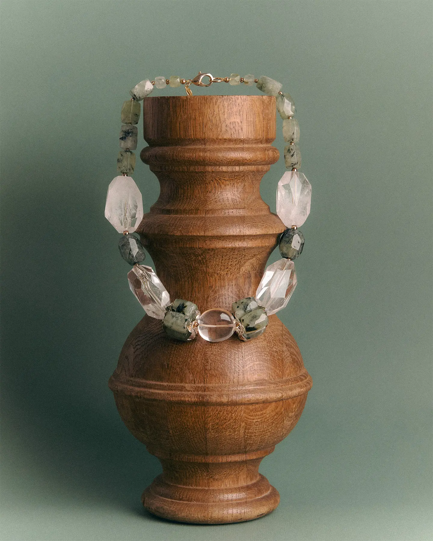 Бусы: крупный горный хрусталь, пренит. Эффектное украшение из очень крупных бусин: горный хрусталь длиной от 4 до 3,5 см и шириной 2,5-2 см. Благодаря размеру бусин хорошо сочетается как с плотными натуральными тканями - хлопок, лен, так и подчеркивает изящество на контрасте с деликатными материями.