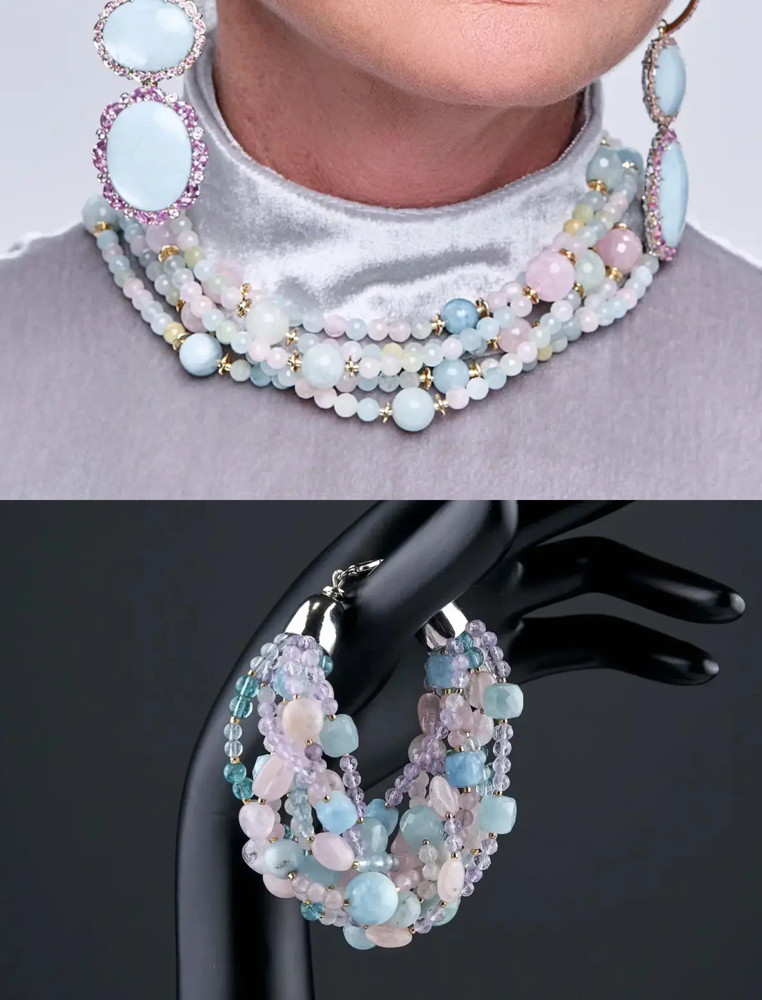 Бусы-трансформер: розовый кварц, берилл, морганит.