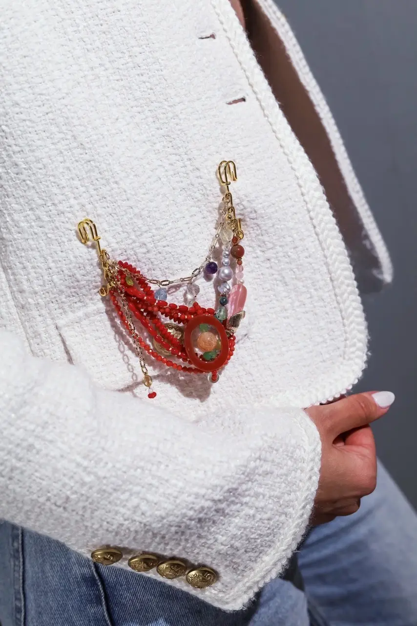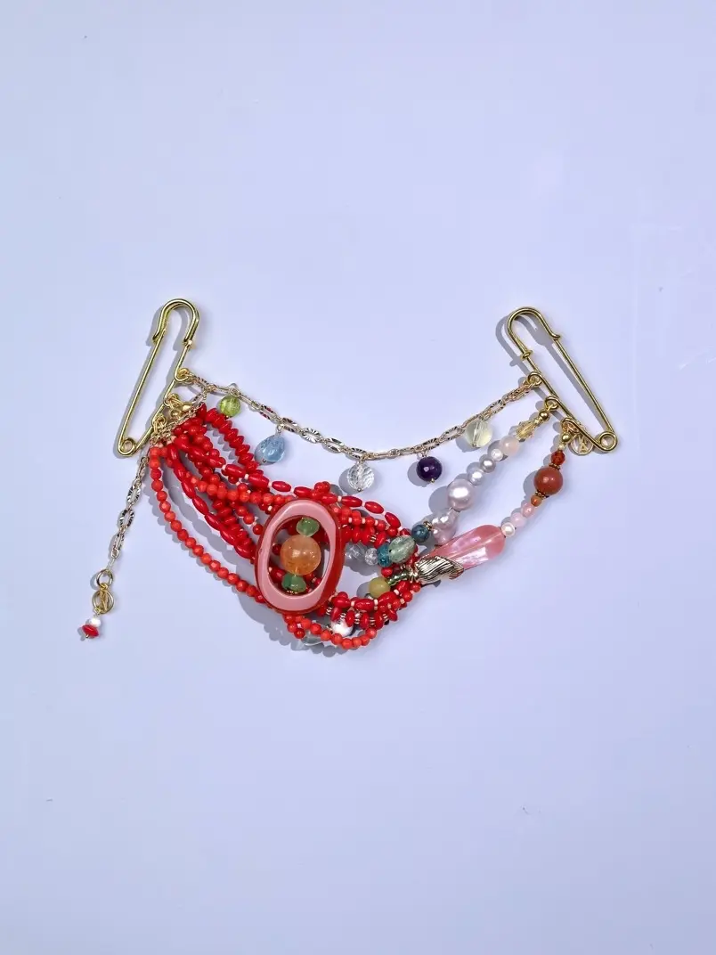 Наша самая фантазийная конструкция ожеброши, где собрано настоящее буйство красок и форм. Насыщенный коралл, сияющий жемчуг, яркий цитрин и нежный флюорит создают дерзкое и радостное сочетание. Эта брошь — для смелых экспериментов: она мгновенно превратит даже простой наряд в художественный жест. Носите её с базовым платьем, пиджаком, сумкой или пальто — она везде будет смотреться как эффектная деталь. Если вы ищете аксессуар, который говорит громче слов, ваш выбор очевиден.