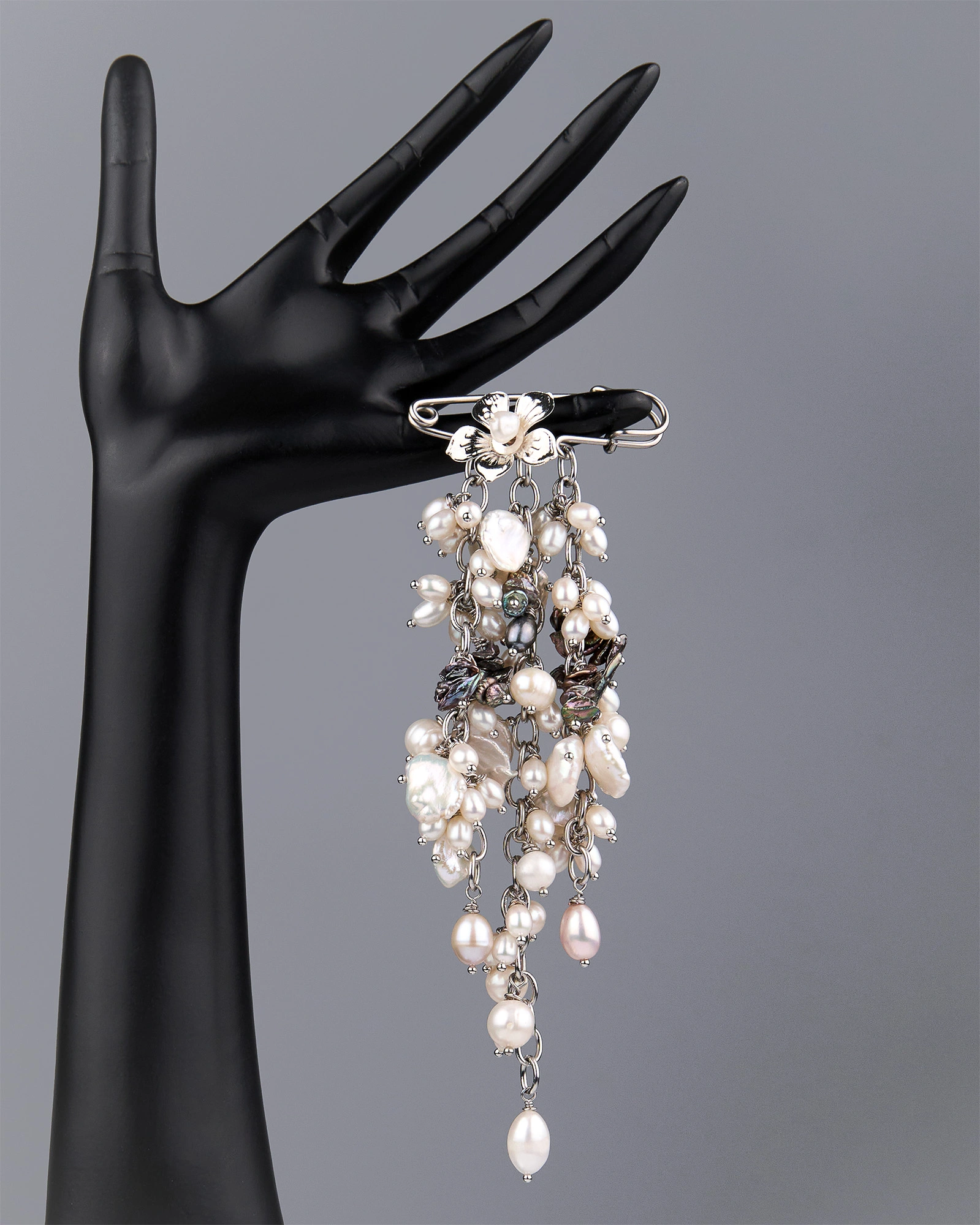 Ожеброшь‑водопад из лепестков чёрного и белого жемчуга создаёт заметный, подвижный акцент на одежде. Длинные каскады жемчужин красиво «работают» при движении, поэтому брошь сразу оживляет жакет, пальто, платье или плотный трикотаж. Украшение подойдёт для тех, кто любит выразительные детали: одной броши достаточно, чтобы даже самый простой образ выглядел эффектно.