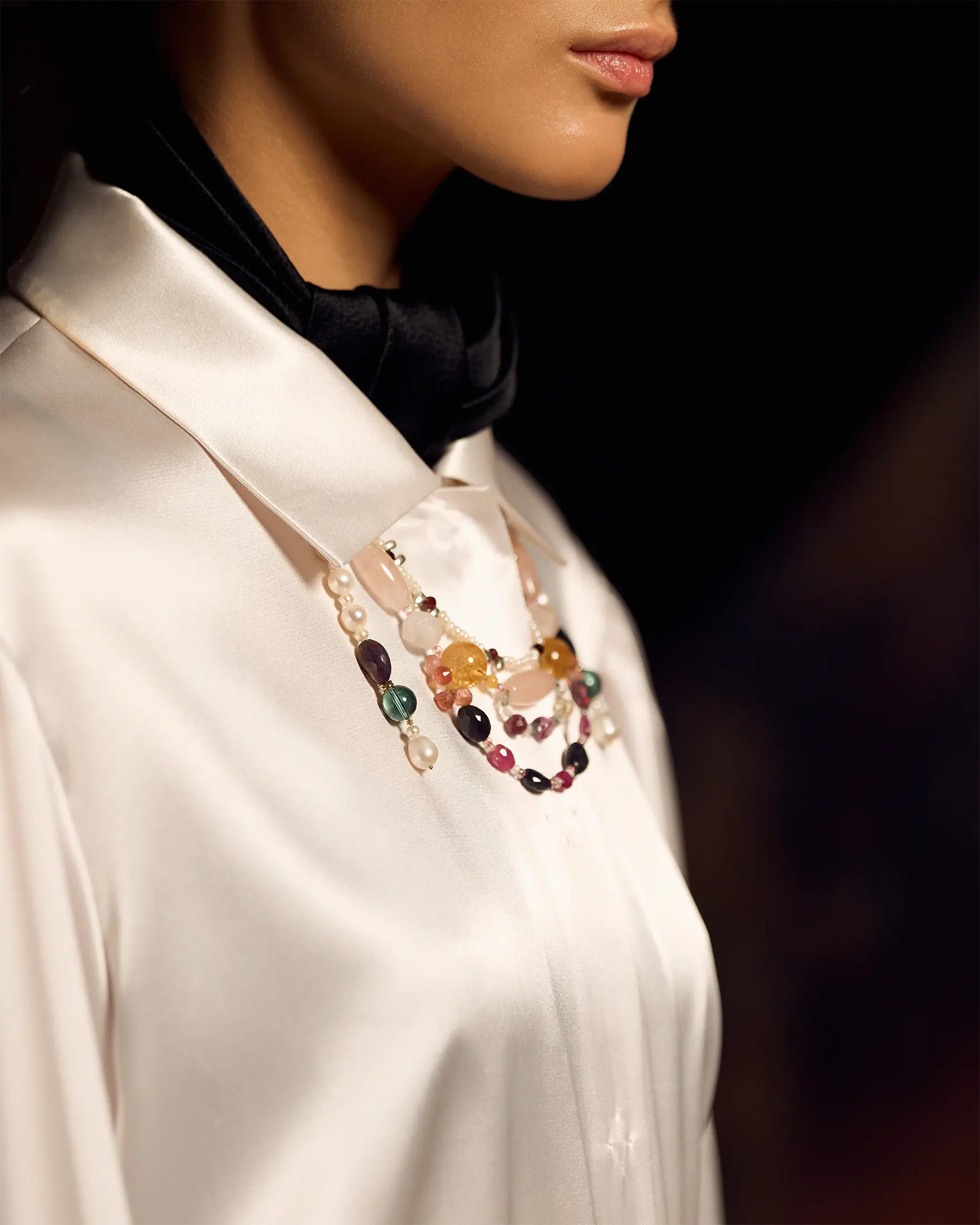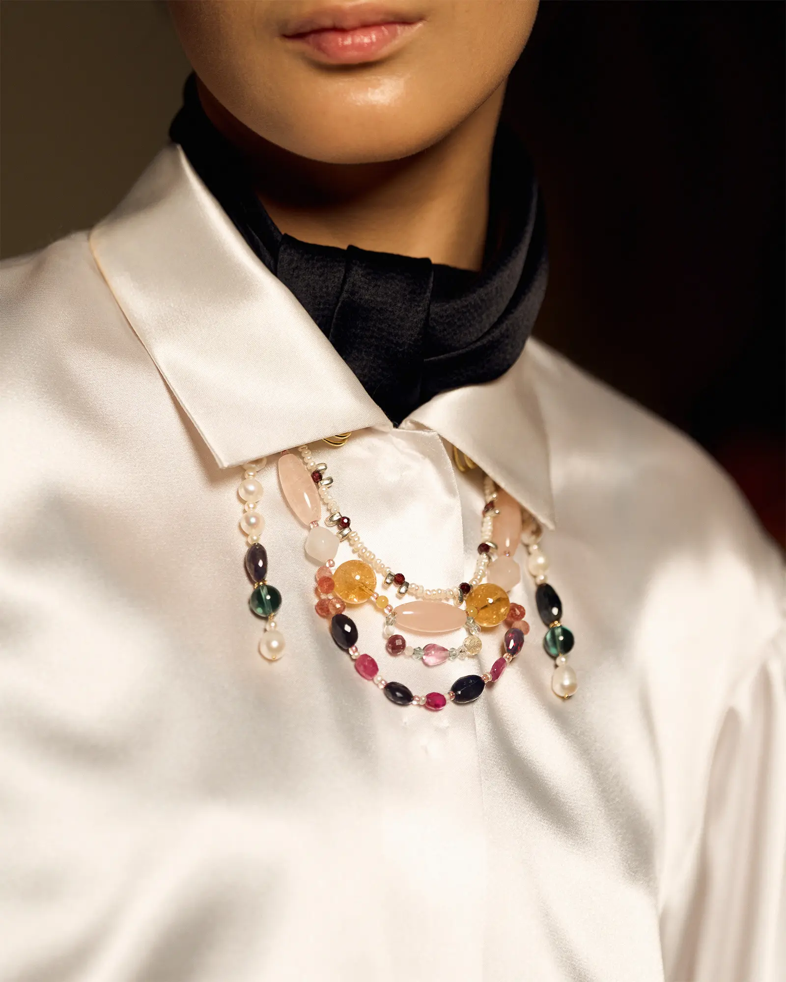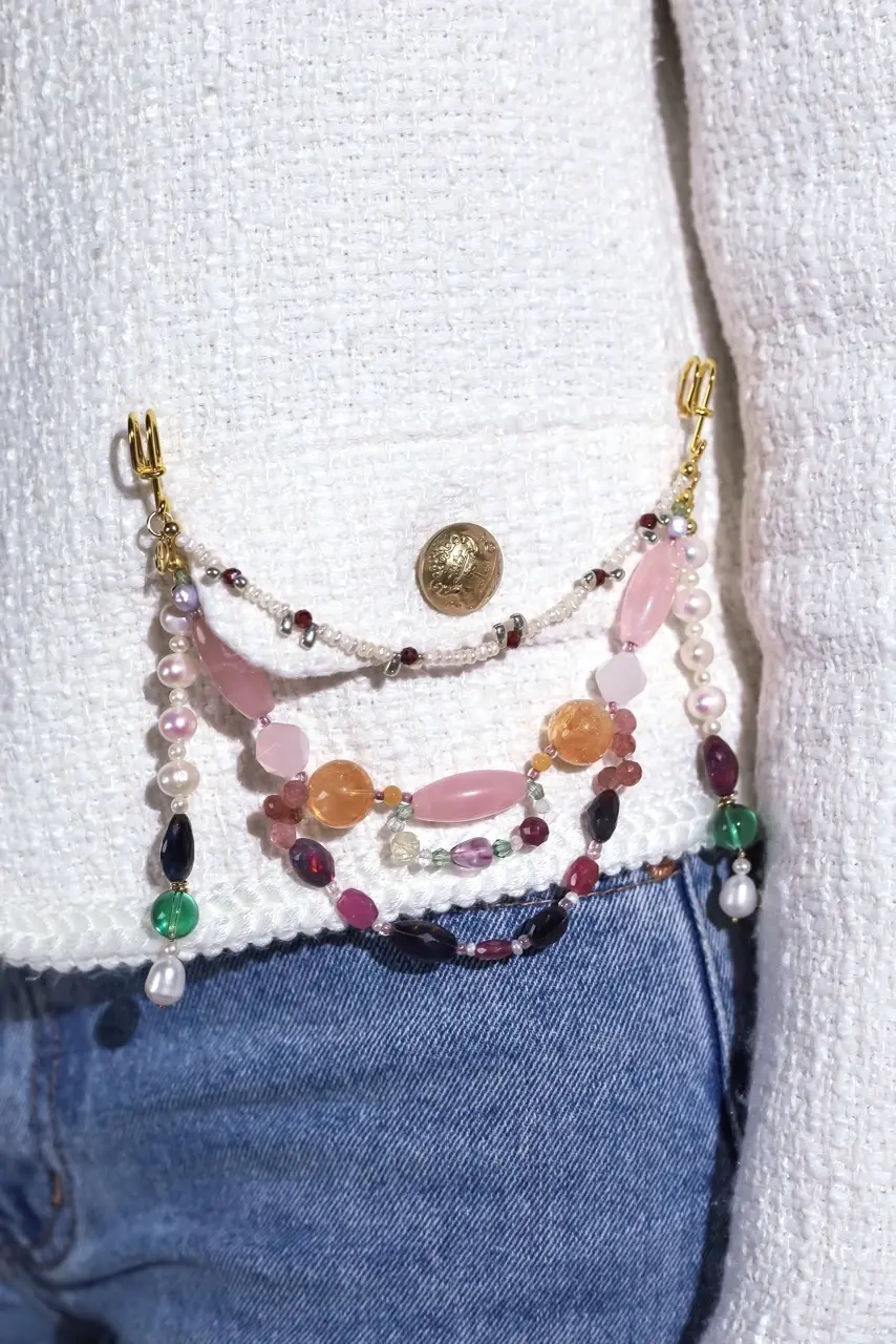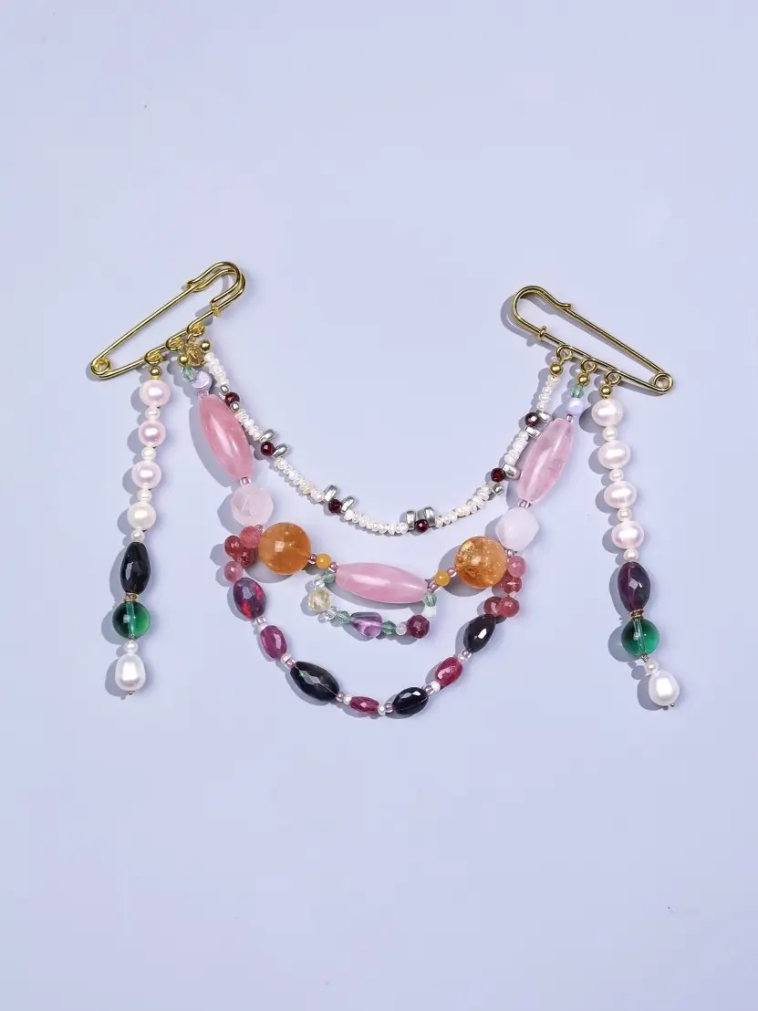 Это не просто ожеброшь, а настоящая коллекция самоцветов: нежный жемчуг и розовый кварц соседствуют с ярким цитрином и сочным гранатом, а флюорит и опал добавляют фантастический блеск. Такой аксессуар не останется незамеченным — он создан, чтобы быть в центре внимания. Просто прикрепите её к карману пиджака, на пальто или сумку, чтобы мгновенно преобразить даже самый простой наряд. Эта фантазийная ожеброшь для тех, кто не боится экспериментировать и уверенно заявляет о своем стиле.