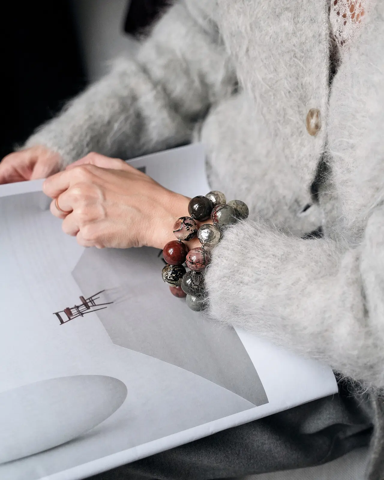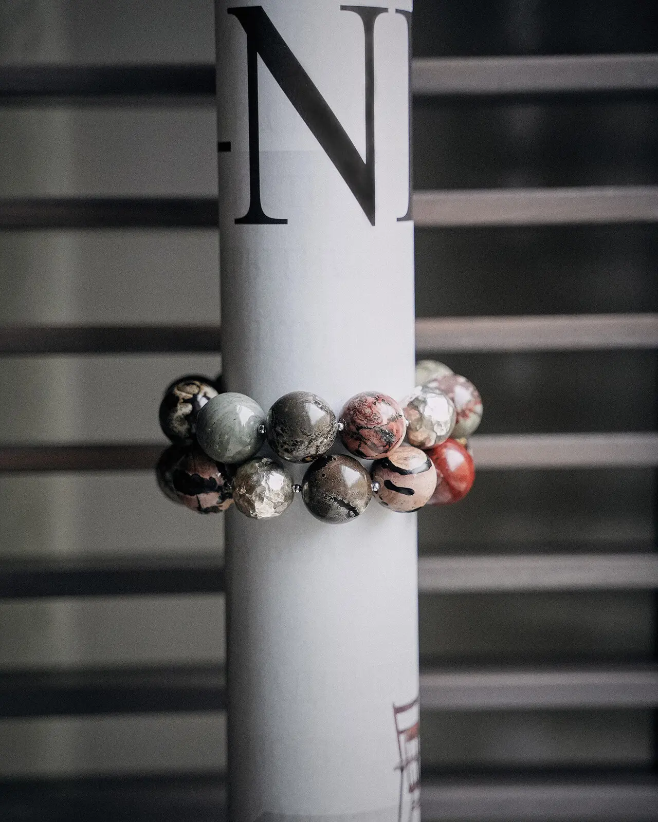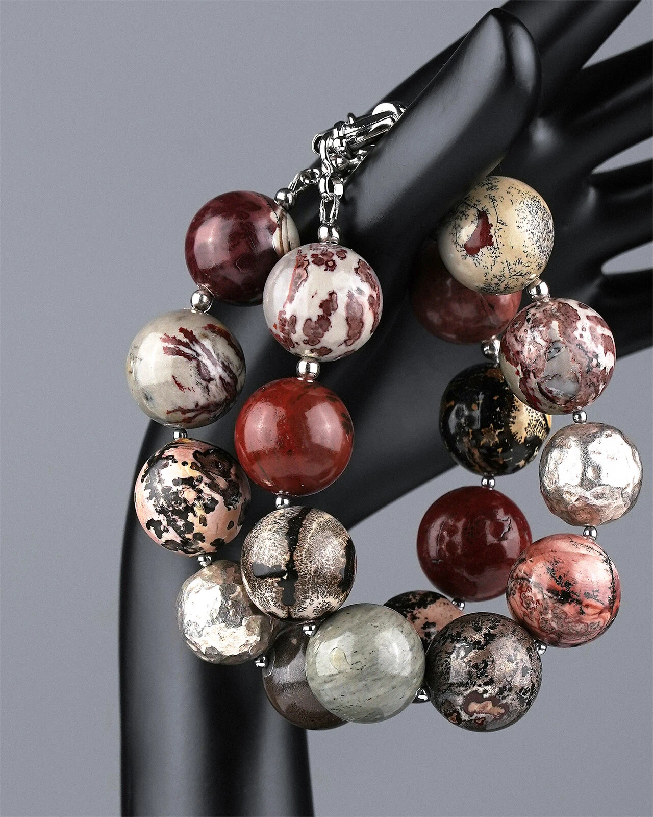 Каждый сантиметр яшмы чохуа — уникальный художественный холст, созданный природой. Неповторимые узоры, где земляные оттенки переплетаются с причудливыми линиями и пятнами, напоминают то акварельные разводы, то древнюю карту неизведанных земель. Крупный диаметр бусин позволяет в полной мере оценить всю сложность и красоту природного рисунка камня, создавая на руке динамичную композицию. Браслет, который хочется разглядывать снова и снова, открывая новые детали в завораживающем узоре яшмы.