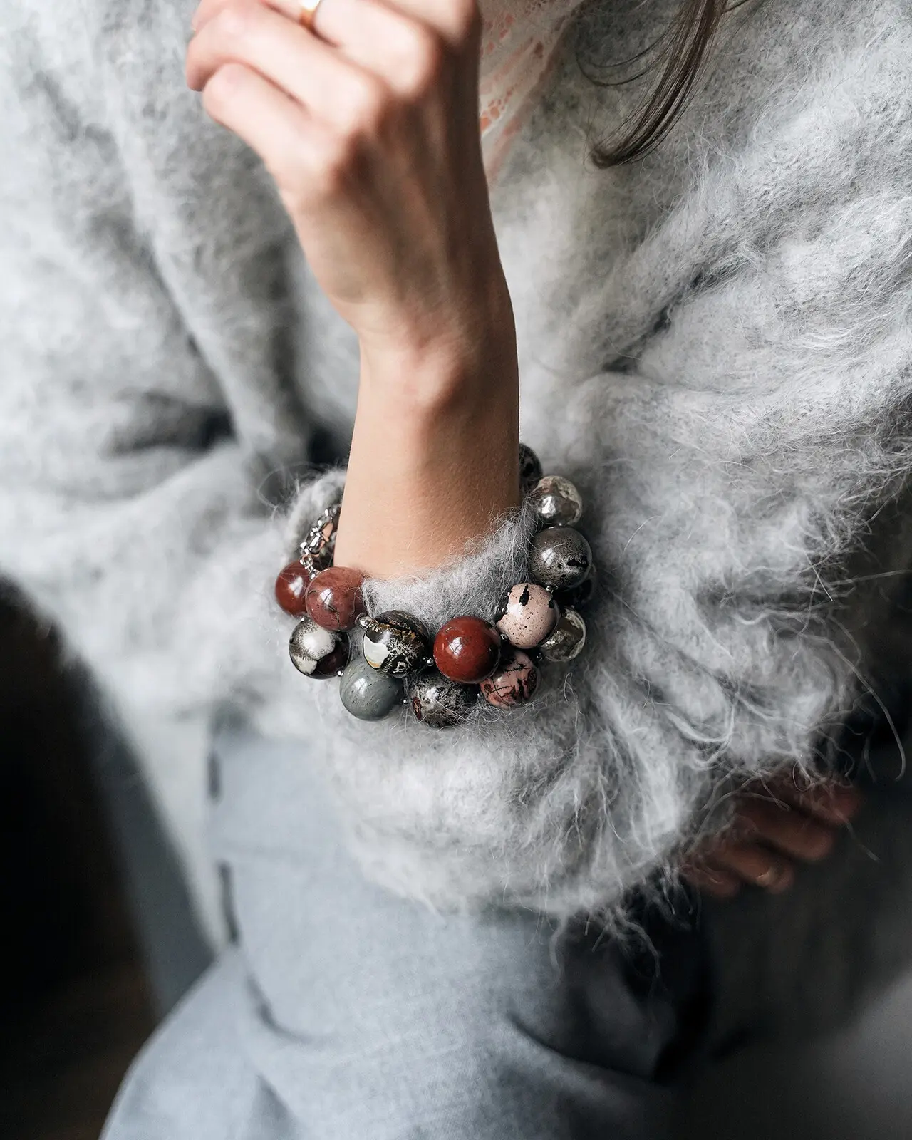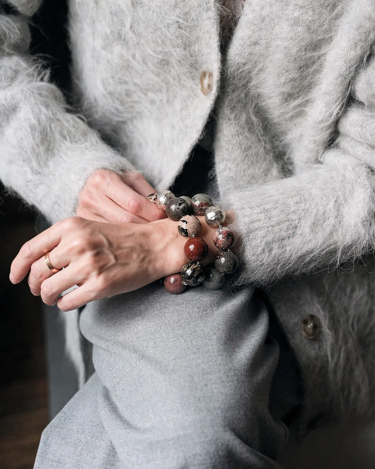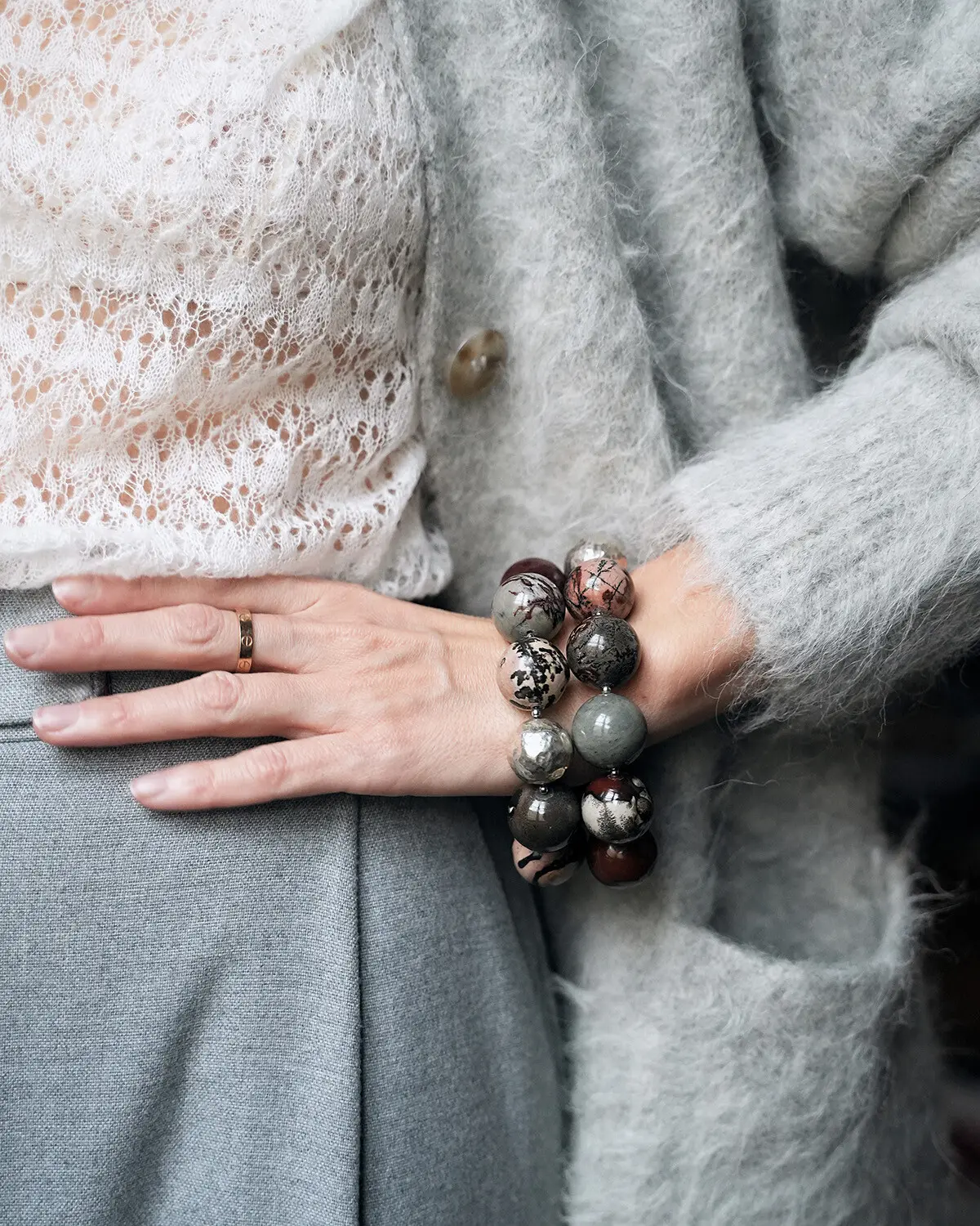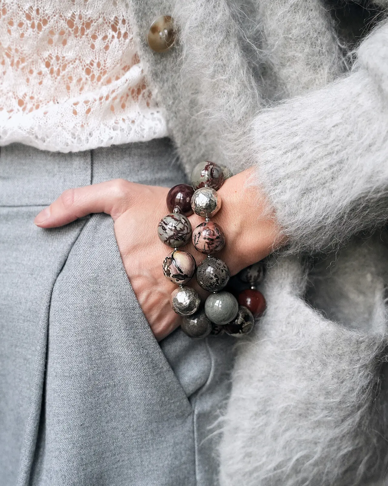Каждый сантиметр яшмы чохуа — уникальный художественный холст, созданный природой. Неповторимые узоры, где земляные оттенки переплетаются с причудливыми линиями и пятнами, напоминают то акварельные разводы, то древнюю карту неизведанных земель. Крупный диаметр бусин позволяет в полной мере оценить всю сложность и красоту природного рисунка камня, создавая на руке динамичную композицию. Браслет, который хочется разглядывать снова и снова, открывая новые детали в завораживающем узоре яшмы.